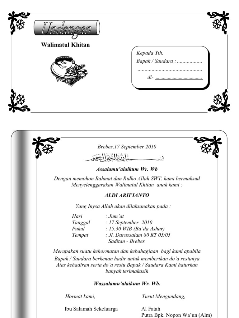 Format undangan khitanan yang bisa di edit ini bisa langsung dibuka di microsoft word selain itu contoh undangan khitanan anak contoh undangan walimatul khitan dan contoh undangan tasyakuran khitanan bisa kamu download gratis kok. Undangan walimatul ursy doc. Hari ini team gelas pecah iseng membuat format undangan khitanan terbaru yang juga bisa digunakan untuk undangan walimatul khitan ms word doc psd cdr. Download kumpulan contoh undangan dalam bentuk doc sagari chan. Undangan walimatul khitan dan aqiqah ramdhani download template undangan walimatul khitan dan aqiqah. Semuanya bisa diedit sesuai kebutuhan dan dapat dicetak di jenis kertas apa pun.