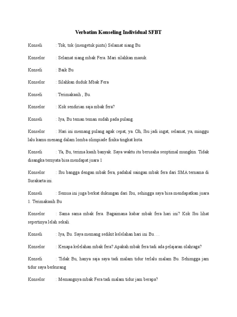 Contoh verbatim konseling individu. Berikut adalah contoh dari verbatim atau dialog konseling individual menggunakan pendekatan behavioral. Sebelum mendownload verbatim konseling behavioral alangkah baiknya bila kita pahami kembali poin penting dari pendekatan ini. Namun apa yang saya sebutkan ini merupakan hal yang sangat penting. Konseling adalah bantuan profesional yang diberikan konselor kepada konseli yaitu anda agar konseli mampu memecahkan masalahproblem yang sedang dihadapi. Eka selalu merasa gemetar dan gugup ketika ia berbicara di kelas. Berikut ini akan dibagikan contoh verbatim konseling individu dengan pendekatan behavioristik semoga verbatim ini dapat memberikan manfaat dan menambah pengetahuan kita tentang bimbingan dan konseling.