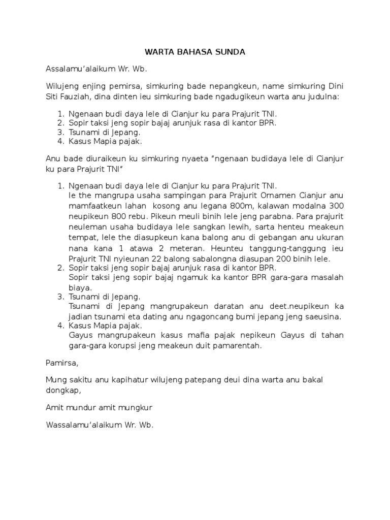 Contoh warta bahasa sunda singkat. Sekian contoh berita bahasa sunda baca juga artikel tentang pengertian berita warta dalam bahasa sunda disini contoh berita bahasa sunda reviewed by unknown on senin 06 april 2015 rating. Warta berita bahasa sunda atau dalam bahasa inggrisnya juga kita kenal dengan news merupakan sebuah artikel dengan tajuk berita atau newsjadi warta bahasa sunda adalah wacana berupa berita yang menggunakan bahasa sunda. Contoh pidato bahasa sunda singkat tentang pendidikan kebersihan perpisahan kesehatan lingkungan narkoba kemerdekaan pemuda agama dll. Contoh berita bahasa sunda tentang bencana alam pamiarsa sadayana nagara indonesia nuju kenging musibah saentosna ntb ayeuna kota palu anu kenging musibah gempa. Dalam artikel ini saya tuliskan beberapa contoh artikel warta tentang bencana alam seperti misalnya tanah longsor gempa dan banjir di jawa barat yang terjadi di penghujung akhir tahun ini dengan menggunakan bahasa sundaartikel berita warta merupakan sebuah artikel yang berisi tentang laporan suatu pristiwa atau catatan tentang suatu kejadian. Dugi ka tanggal 4 oktober 2018 warga anu maot aya 1424 jumlahnya aya 1407 jasad anu tos dikubur sesana teu acan.