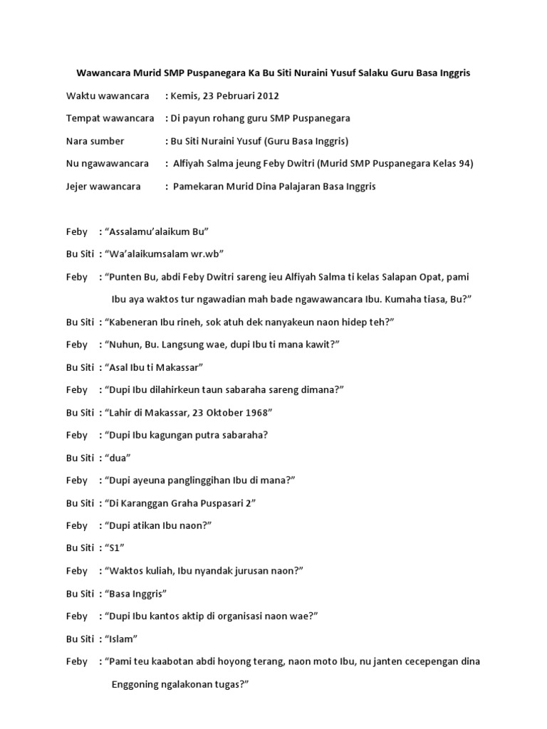 Guru agama tempat jeung waktu wawancara tempat. Neng sari nu ngawawancara. Contoh wawancara bahasa sunda dengan seorang tokoh tujuan. Nganyahokeun yen tingkah laku budak jaman ayeuna teh kos kumaha. Secara umumnya kegiatan wawancara ini dapat dilaksanakan oleh berbagai macam cara seperti. Contoh wawancara menurut kamus besar bahasa indonesia wawancara adalah proses tanya jawab lisan antara dua orang atau lebih secara langsung.