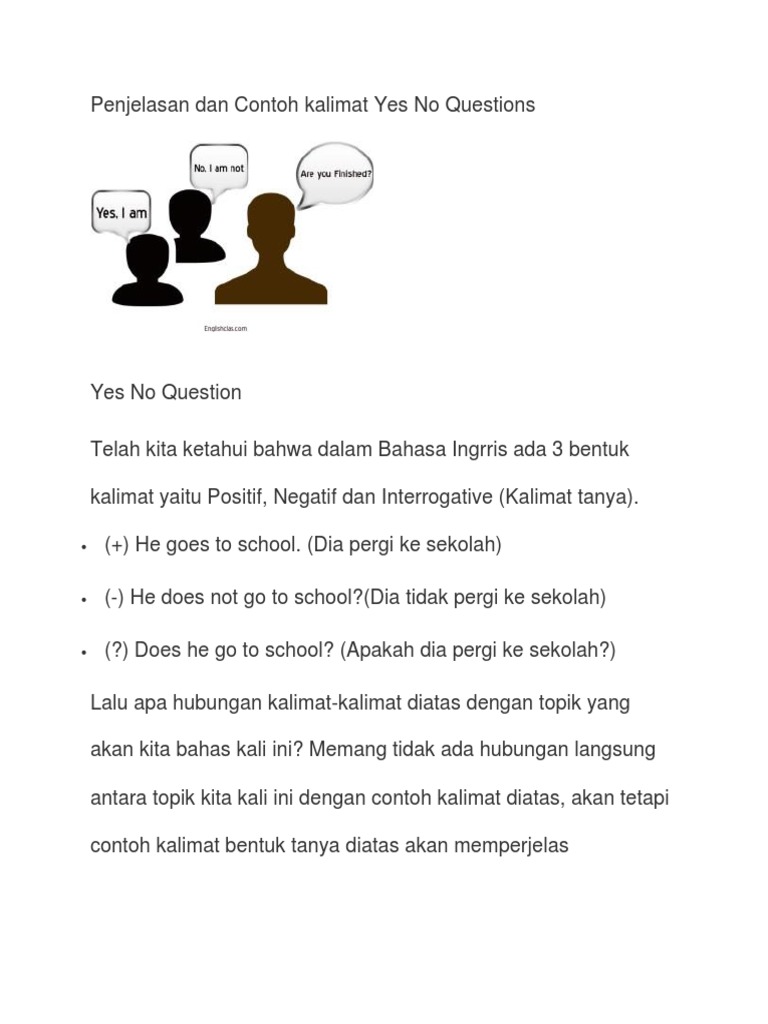 Pengertian bentuk rumus yesno question beserta contoh lengkap setiap orang pasti pernah mengajukan sebuah pertanyaan untuk mendapatkan jawaban yang diinginkan nya baik dalam bahasa indonesia maupun dalam bahasa inggris. Penjelasan dan contoh kalimat yes no questions pada artikel sebelumnya kita telah membahas tentang wh questions dan pada artikel kali ini saya akan membahas jenis pertanyaan dalam bahasa inggris yang satunya yaitu yes no questionstapi sebelum masuk ke topik tersebut simaklah beberapa contoh kalimat dibawah ini. Mari kita pelajari lebih detil. Jusuf kalla was the 10th vice president of indonesia. Soal soal tersebut disusun supaya melatih pemahaman terhadap materi yes no questions yang telah dijelaskan sebelumnya.